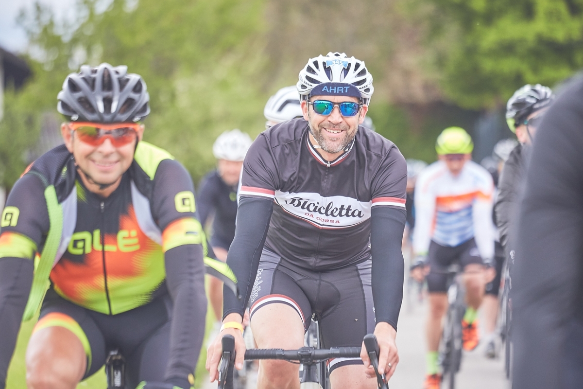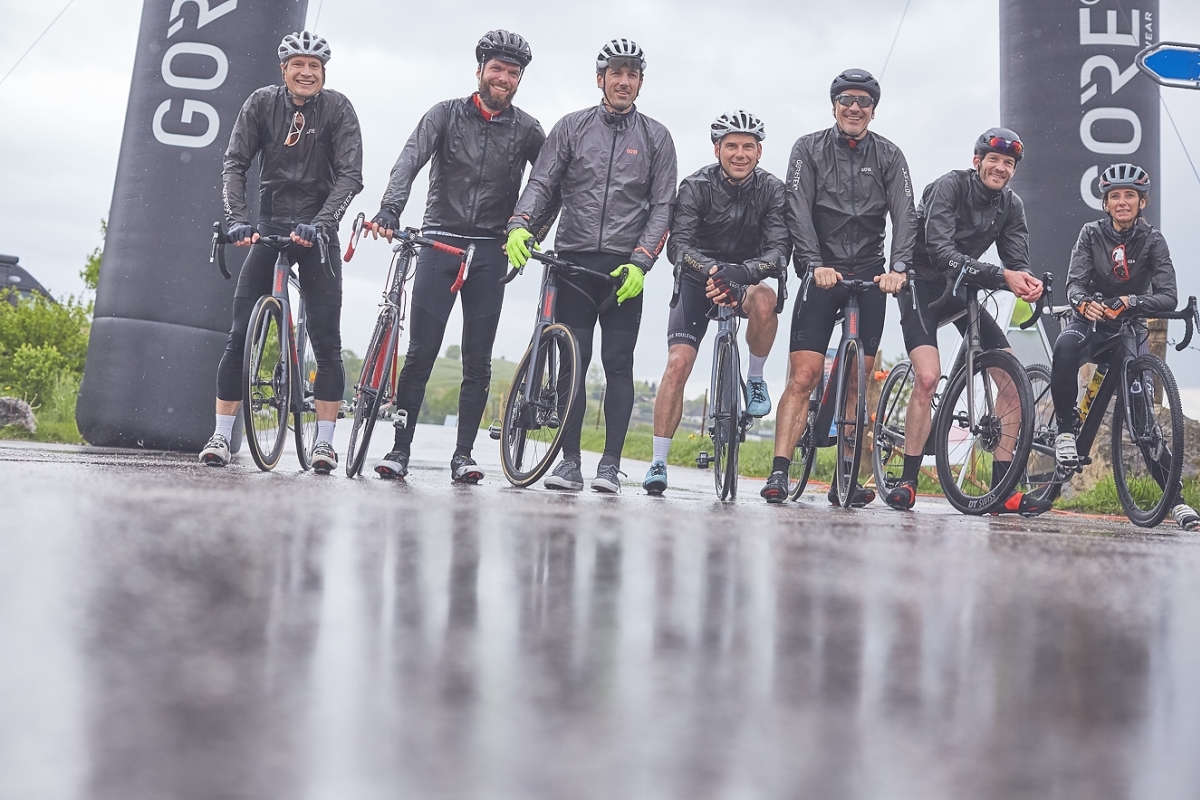 Einer, der Fabian wirklich persönlich beim Kaffeetrinken noch ausquetschen durfte war Michael: „Ich habe das Meet & Greet beim Gore Wear Gewinnspiel gewonnen und bin heute früh extra aus Gera angereist. Auch wenn es ein weiter Weg ist, wie oft werde ich schon die Chance haben, mit einem echten Rennrad-Superstar auf einen Kaffee zu gehen?“Nach einer kurzen Begrüßung durch Fabian Cancellara selbst rollten Punkt 11:00 Uhr die Teilnehmer gesammelt durch den Startbogen. Die 41km lange Strecke und der vorgegebene „Social Pace“ sorgten dafür, dass genügend Zeit für Gespräche und Scherze mit dem Star blieben – auch wenn der Regen die letzten Kilometer deutlich nasser als erwünscht gestaltete.