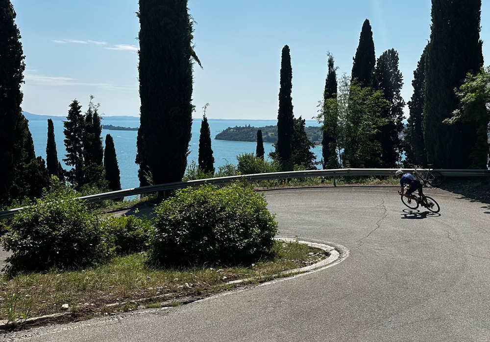 Severin und Jürgen sind über die Dörfer Calvagese della Riviera und Puegnago sul Garda Richtung Salò und dann nach Gardone Riviera geradelt, um von dort die einsame und perfekt geteerte Serpentinen-Straße vorbei am historischen Vittoriale degli Italiani und Richtung San Michele hochzufahren. Begleitet von atemberaubenden Ausblicken auf den Gardasee rollten sie dann entspannt über eine mit Zyressen gesäumte Serpentinenstraße nach Gardone Rivera wieder runter. Über Barbarano und Salò führte ihr Weg dann schlussendlich wieder zur Villa Mocasina.